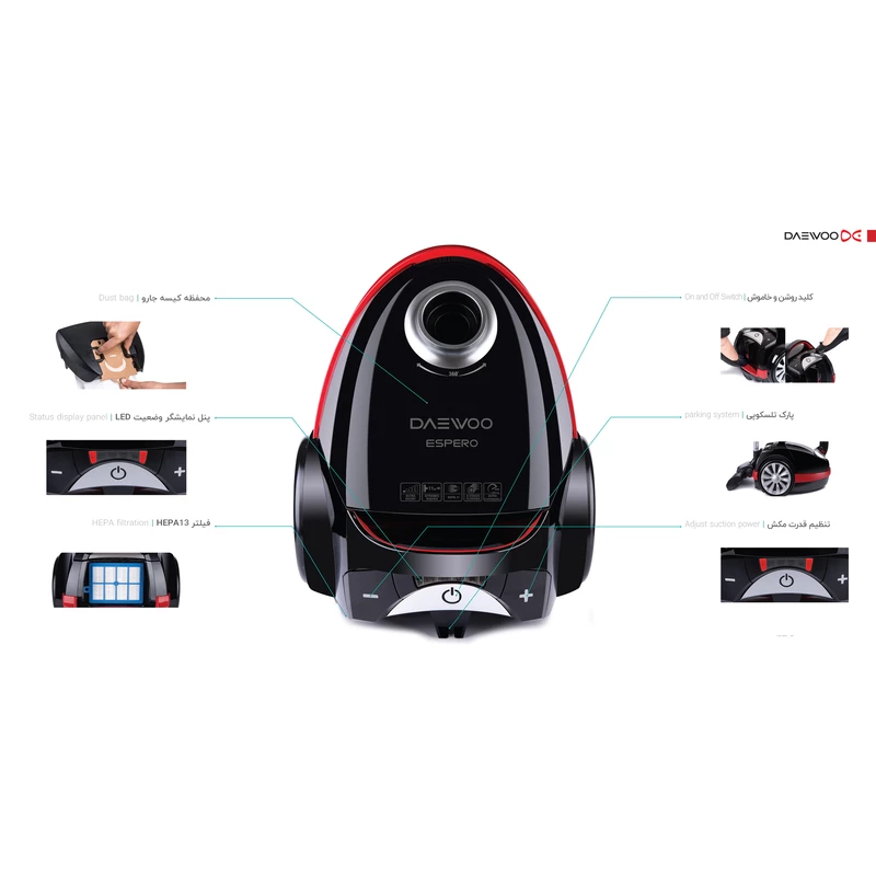 جاروبرقی کیسهدار دوو مدل DVC-LH22R، با فیلتر HEPA 13، وزن 10 کیلوگرم، دارای سه عدد سری مجزا، کنترل روی دسته، موتور با توان مکش 650 وات، میزان صدا 70 دسیبل، طول کابل برق 8 متر، گنجایش مخزن 4.5 لیتر، دارای کیسه یکبار مصرف، دارای لوله تلسکوپی قابل تنظیم
