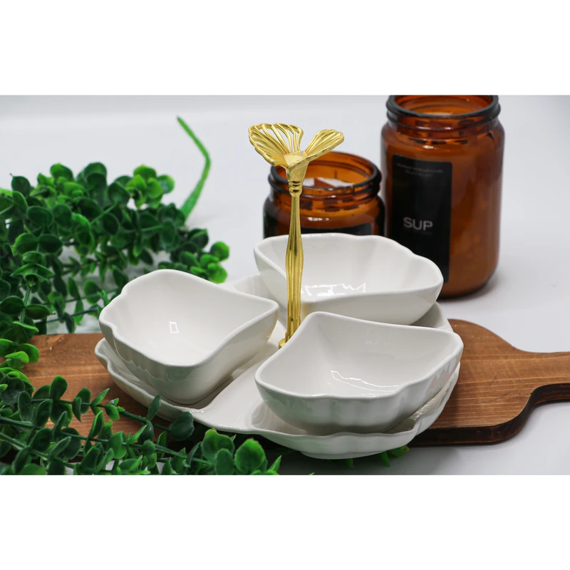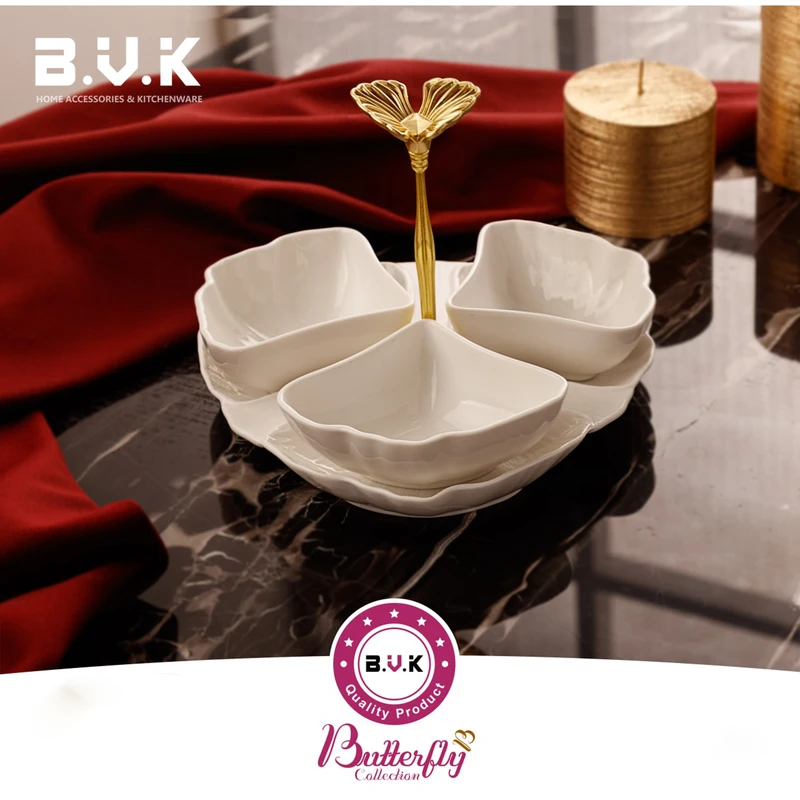 اردو خوری ۳ خانه طرح پروانه همراه با سینی برند بی.وی.کی بسیار شیک و مدرن جنس بدنه : سرامیک - مناسب برای سرو شیرینی و تنقلات